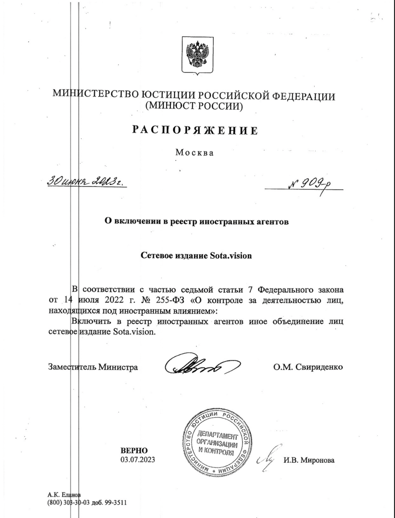 Минюст считает, что, раз SOTA.vision в своих публикациях ссылается на других иностранных агентов (проект «ОВД-Инфо», телеканал «Дождь», издание «Радио Свобода» и другие), это «свидетельствует об оказании изданию SOTA.vision нематериальной поддержки в виде предоставления указанных сообщений и материалом, за счет которых истцом формируется наполнение» соцсетей. Эта позиция властей абсолютно нелогична. Вся информация, размещенная на сайтах любых медиа, является публичной. Никому не требуется получать разрешение, чтобы в своих постах или материалах сослаться на текст другого СМИ.