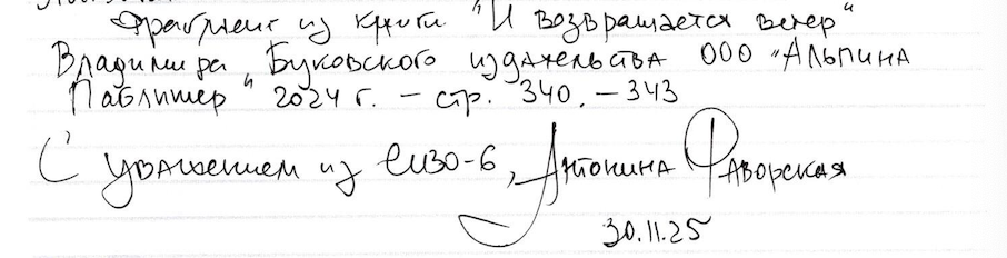 Антонина попросила опубликовать свое письмо с отрывком из книги советского диссидента Владимира Буковского о политических процессах. Вот это письмо.