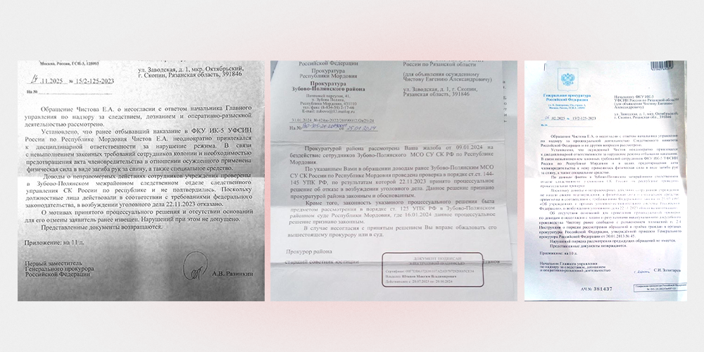 Одновременно в распоряжении «Первого отдела» есть и свидетельства заключенных, подтверждающих применение пыток к Евгению Чистову. Один из осужденных сообщает, что в ИК-5 Мордовии сотрудники колонии систематически издеваются над заключенными и доводят их до самоубийства, а сотрудники Дубравной спецпрокуратуры и Зубово-Полянского межрайонного следственного отдела СК по Мордовии, по его словам, покрывают эти действия.