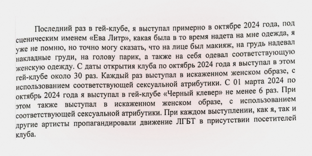 Через два с половиной месяца после рейда в «Черном клевере» силовики пришли к дрэг-артисту Александру Княгину. С 2019 года он выступал под псевдонимом Ева Литр в разных кировских клубах и до дела «Черного клевера» ни разу не сталкивался с давлением. Когда в 2023 году несуществующее «Международное движение ЛГБТ» признали «экстремистской организацией», это не вызвало реакции в кировском дрэг-сообществе. «Кажется, кто-то в беседе скинул, что появилось такое решение, но внимание на это никто не обратил, — рассказывает Княгин, — Мы работали, выступали и не считали, что это является пропагандой». Княгина не было в «Черном клевере» во время рейда, он узнал о нем на следующий день от подчиненного на работе — на тот момент он работал директором в «Пятерочке».