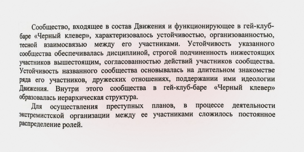 В материалах дела «Черный клевер» описывают как место, в котором сложилась «дисциплина, строгая подчиненность нижестоящих участников вышестоящим» — в подобных делах выдумывают строгую иерархию, даже если на самом деле ее не было. Ни организации «Международное движение ЛГБТ», ни ее подразделений, конечно же, не существует, а решение решение Верховного Суда о его запрете юридически безграмотно.