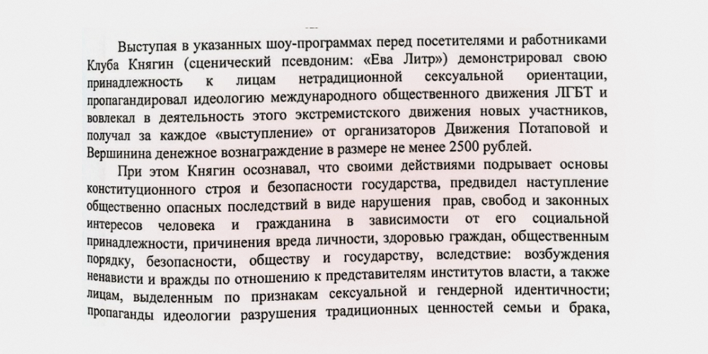 Участие Княгина в «движении ЛГБТ», по мнению следствия, заключается в том, что во время выступлений он «демонстрировал свою принадлежность к лицам нетрадиционной сексуальной ориентации», пропагандировал идеологию «движения» и вовлекал в него новых участников. Действовал он «из экстремистских побуждений» и «с целью извлечения прибыли».