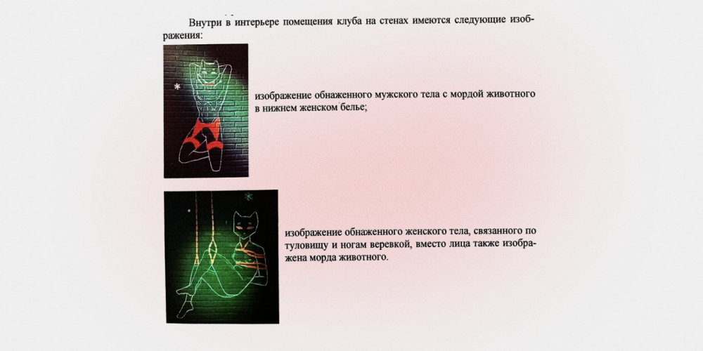 «Черный клевер» никогда открыто не заявлял, что поддерживает ЛГБТ. «Дрэг-шоу в России не запрещены, для полиции мы были обычным ночным клубом», — говорит Потапова. Проблемы начались в январе 2024 года: бар оштрафовали на 500 тысяч рублей за «ЛГБТ-пропаганду». По версии суда, она заключалась в рисунках людей с кошачьими головами на стенах, выступлении открытого гея и поцелуе двух мужчин, который попал на камеру во время составления протокола. После решения суда «Черный клевер» закрасил котов на стенах, перестал приглашать выступать открытых геев и запретил гостям целоваться.