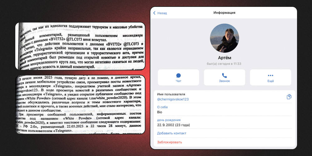 Фото: отрывок из допроса Абрамова и его аккаунт в телеграме / материалы дела предоставлены Данилом Фроловым