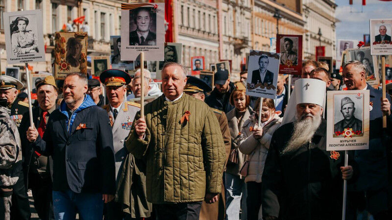 Фото: губернатор Петербурга во главе «Бессмертного полка» в 2025 году.